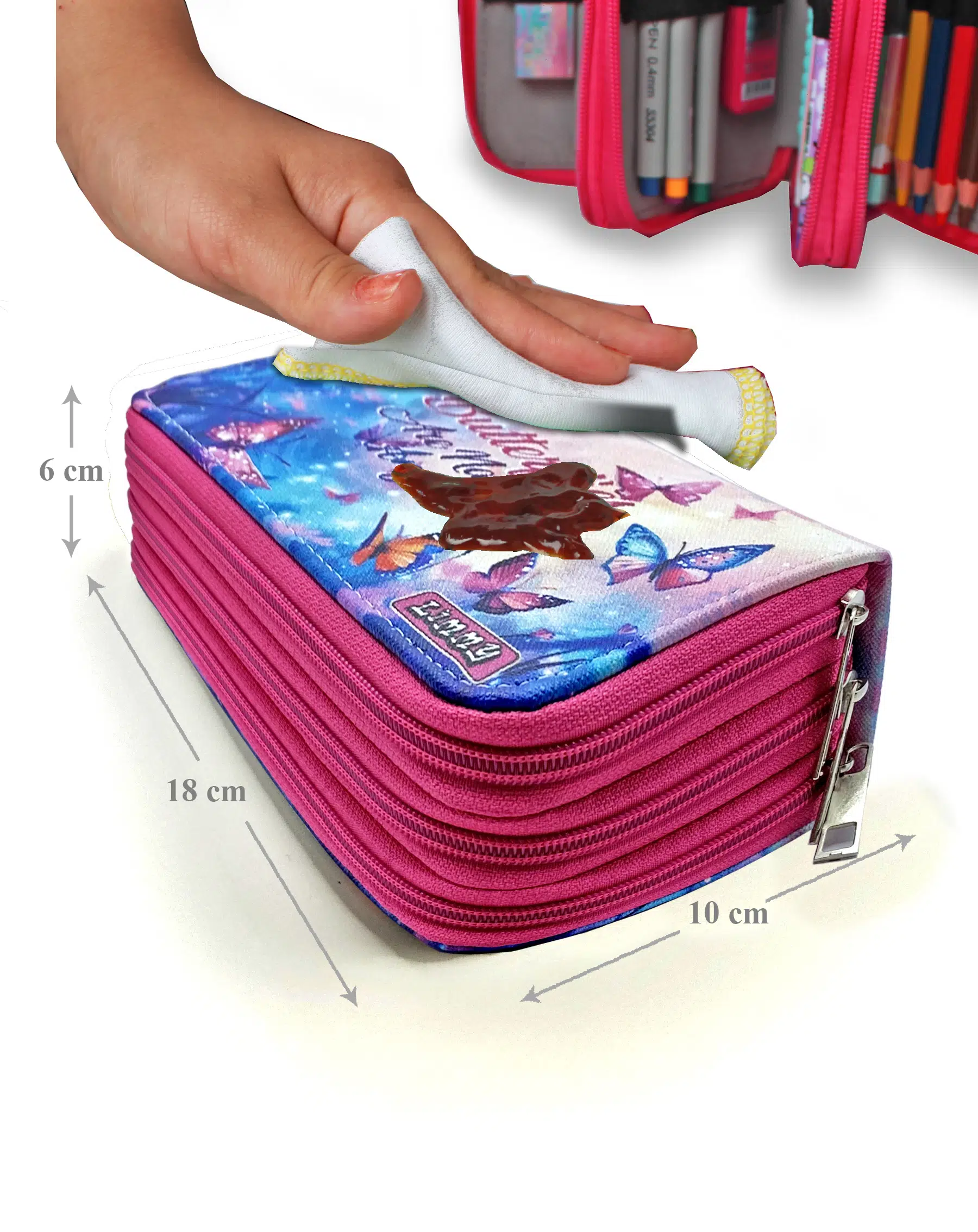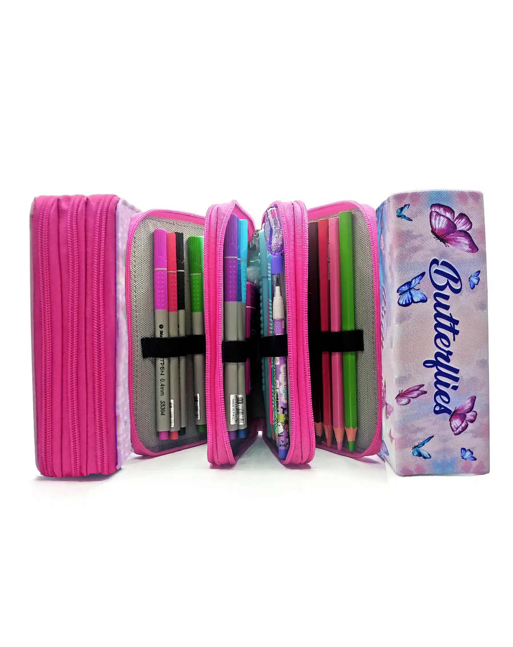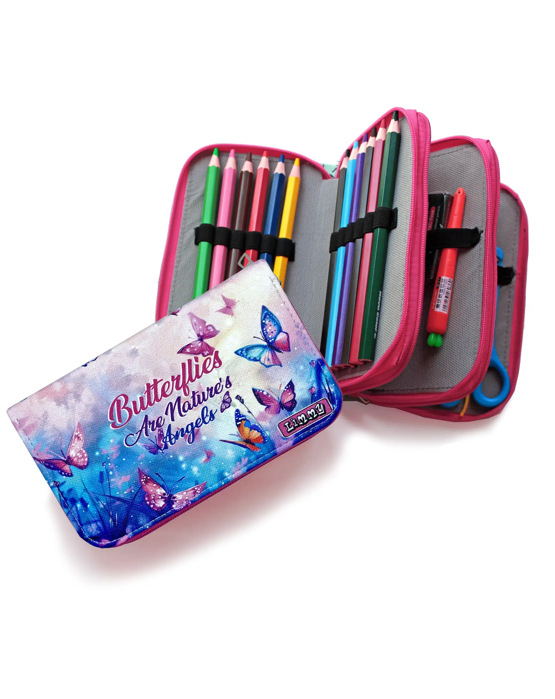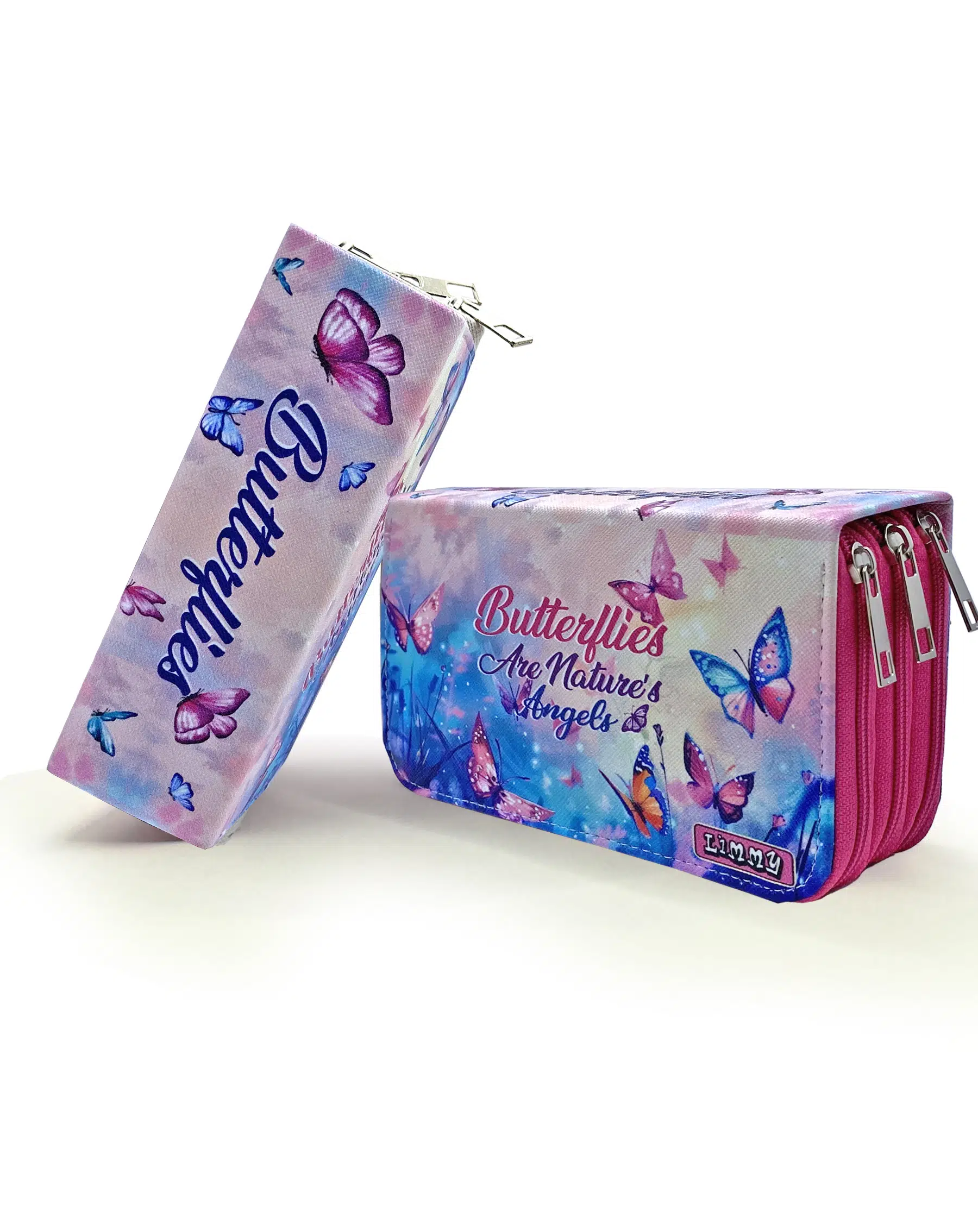 Limmy Kalem Kutusu Kelebek Kawai Organizer Kalemkutu Vegan Deri Üç Bölmeli Kalemlik -Pembe
